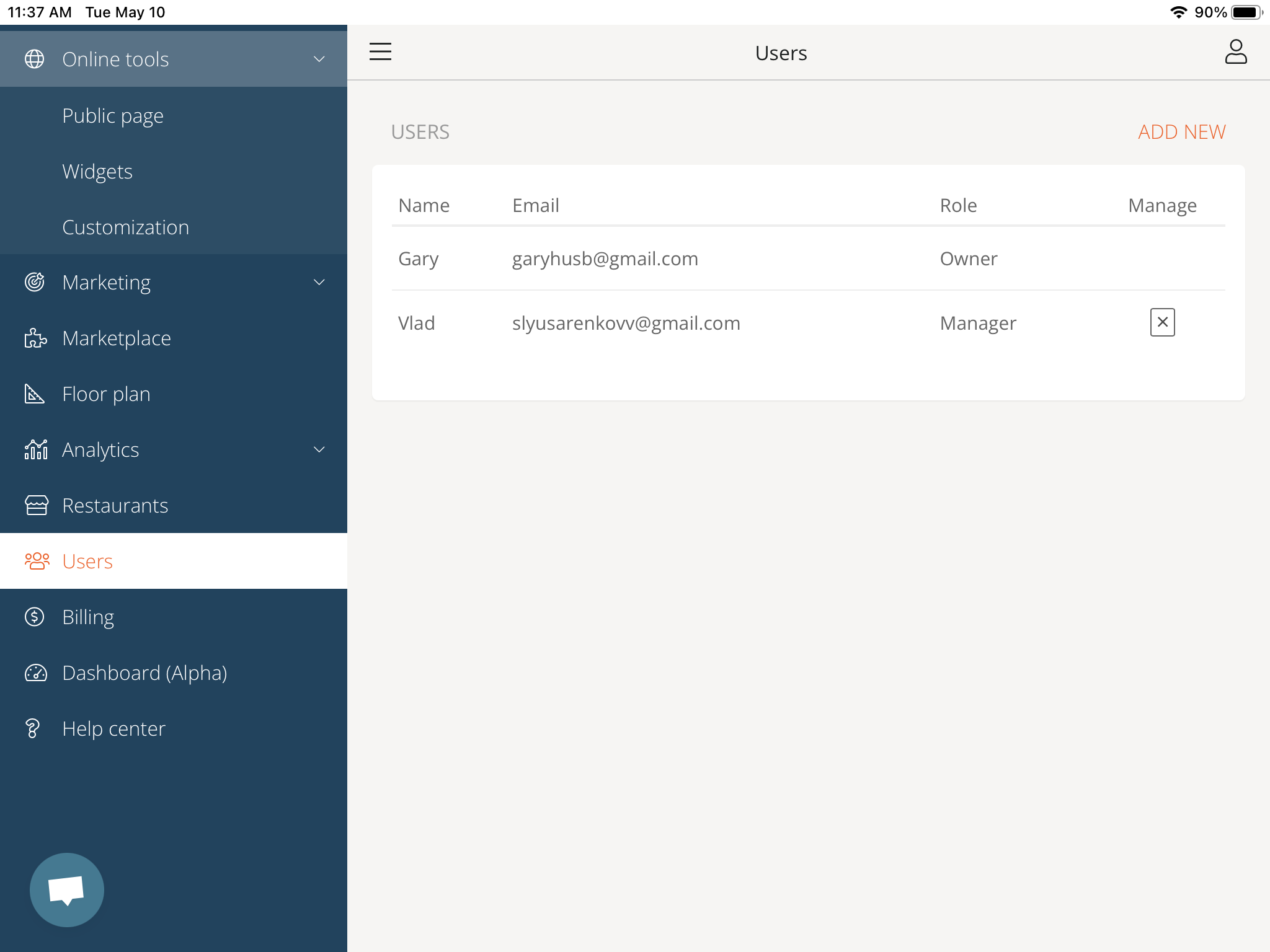 - Manager – Can't delete owner or restaurant. Can add restaurants.