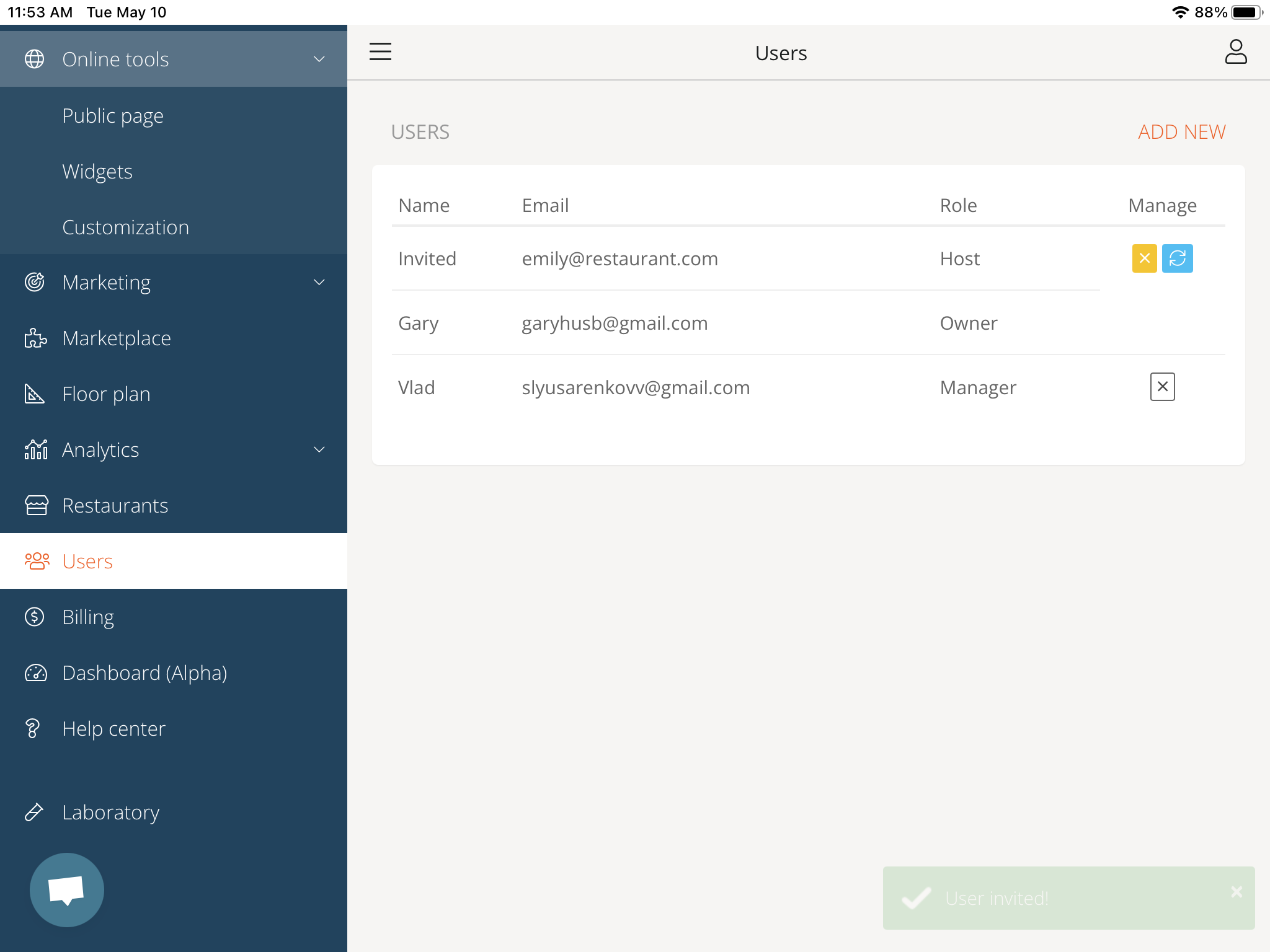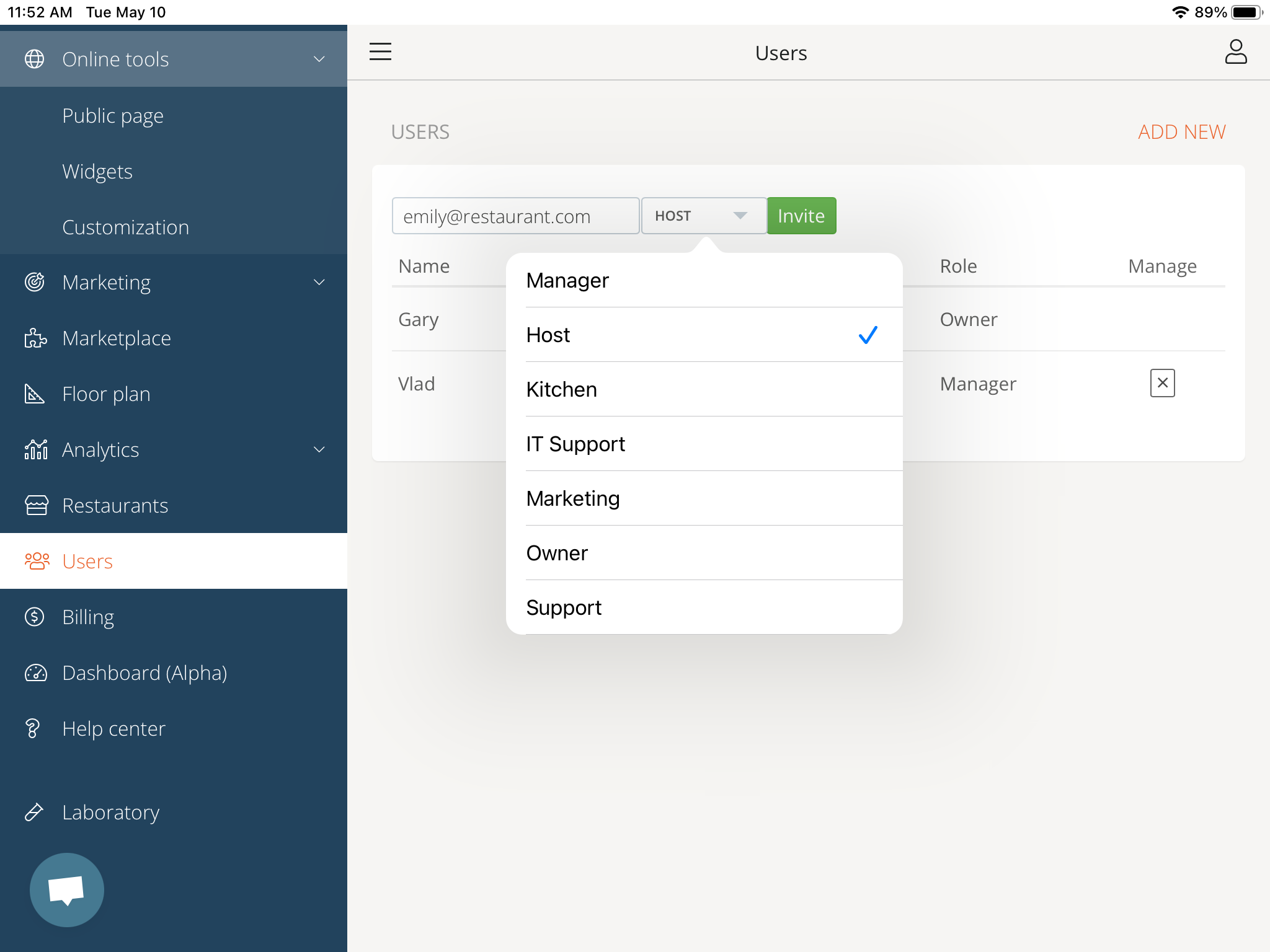 - Host – Can't manage restaurant settings or be assigned to tables. Can manage reservations, waitlists, tables, guestbook, servers and all features in the main ResEasy panel.